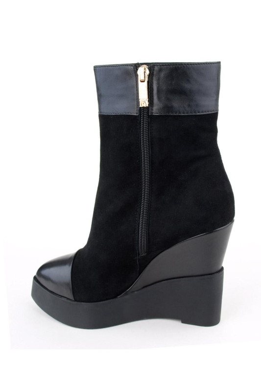 Стильные женские ботильоны на скрытой танкетке. Отделка ботильон из замшевой кожи и кожи гладкой. Фурнитура желтого цвета. Застегиваются на боковую молнию с внутренней стороны. Внутри кожа, кожаная стелька.