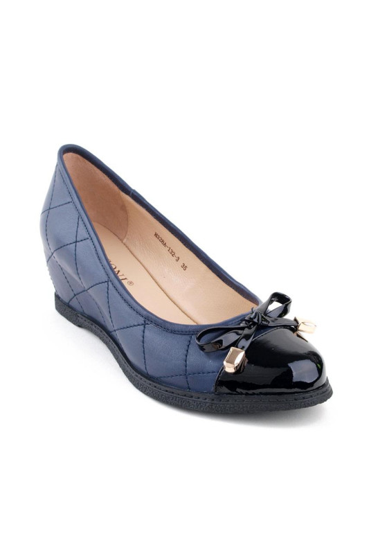 Стильные женские туфли на невысокой скрытой танкетке. Туфли из мягкой телячьей кожи синего цвета, носок черный лаковый. Впереди аккуратный бантик.