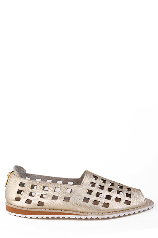 Женские туфли на низком ходу золотистого цвета на белой тракторной подошве. Туфли выполнены из натуральной кожи, внутри кожа, кожаная стелька. Туфли на низком ходу, без каблука. Туфли максимально легкие и открытые, за счет крупной перфорации ноге будет комфортно даже в самый жаркий летний день.