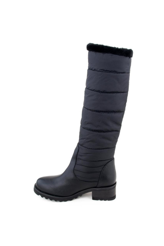 Зимние женские сапоги дутики. Сапоги черные, внутри на меху, застегиваются на боковую молнию. Толстая тракторная подошва черного цвета.