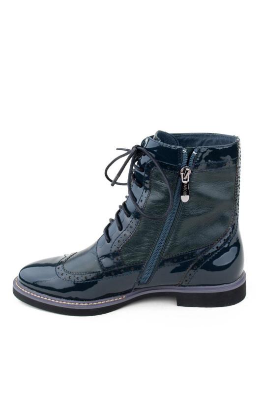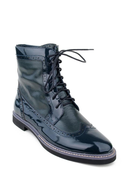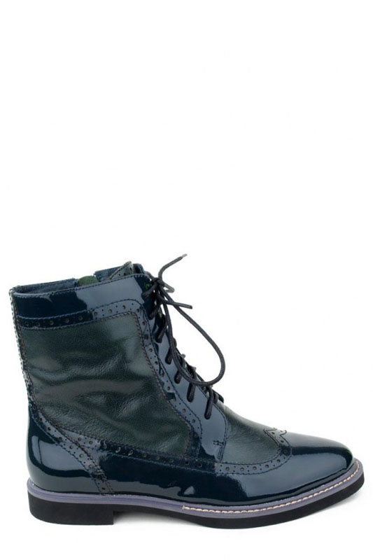 Женские ботинки зеленого цвета, из натуральной лаковой кожи. Ботинки на шнуровке, сбоку молния. Ботинки на низком ходу, небольшой широкий каблук, круглый носок. Ботинки отделаны под оксфорды.