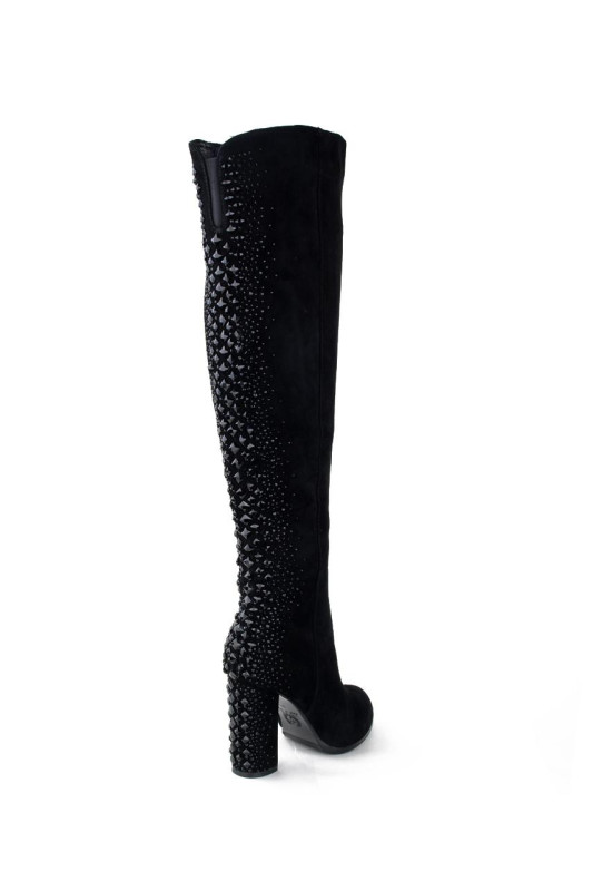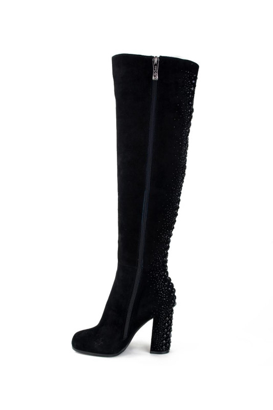Стильные женские сапоги M.M.8. Сапоги отделаны натуральной замшевой кожей черного цвета. Внутри цигейка до голени (еврозима). Застегиваются на боковую молнию по всей длине сапог. Квадратный устойчивый каблук обтянут замшей. Сапоги выше колена.